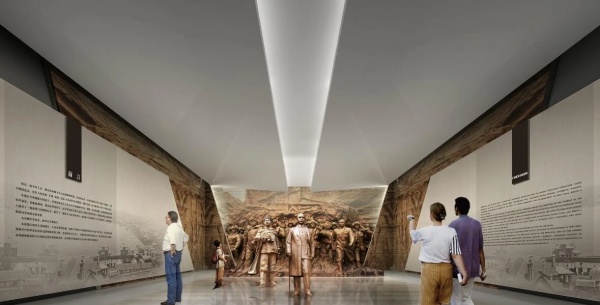原建筑序廳空間為6900mm寬、10000mm進深, 擁有良好的縱深感,為此,我們設計孫中山鄧世昌、張弼士以圓雕的形象迎面走來,背后跟隨諸位膠東革命志士、政軍人物、文藝名人、實業楷模奮勇向前,追求民族的獨立和解放。觀眾可穿行其中,感受與這些名人同行的信念,兩側藝術肌理墻以開放的形態寓意開拓、拼搏精神的延續與傳播。