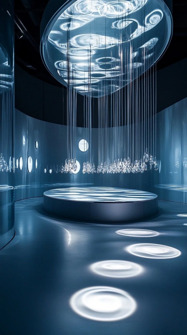 ?中庭“古蜀科幻之眼”?:仿青銅面具輪廓的無(wú)縫鏡面飛天梯,以幾何切割線條強(qiáng)化視覺(jué)沖擊力,游客登梯時(shí)仿佛被吸入“蟲(chóng)洞”;異形GRG門(mén)洞采用參數(shù)化設(shè)計(jì),模擬潮汐力場(chǎng)扭曲效果,配合全息投影引導(dǎo)人流,實(shí)現(xiàn)功能性與藝術(shù)性的統(tǒng)一。